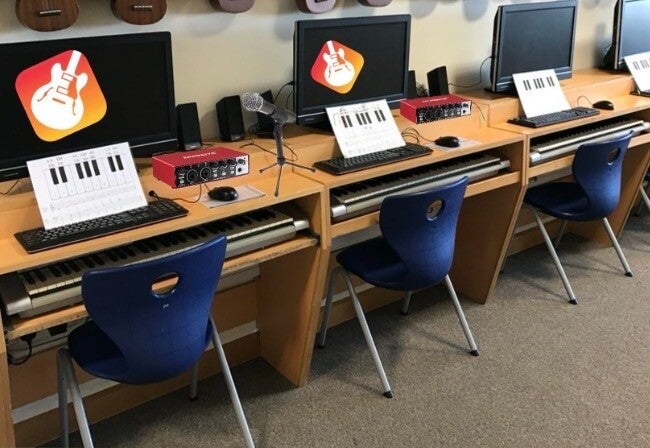 Here is pictured an example of what the technological part of my music classroom, with GarageBand software, auto interface equipment, and microphones.